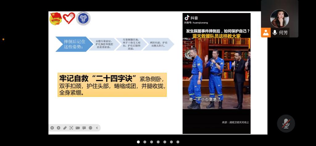 线上宣讲,无法进行现场的紧急疏散演练,志愿者便通过放映视频的形式,让同学们熟知遇到相关问题该如何自救——摔倒后牢记双膝尽量前屈,护住胸腔和腹腔的重要脏器,尽量侧躺在地,两手十指交叉相扣,护住后脑和颈部,两肘向前,护住双侧太阳穴。牢记自救“二十四字诀”紧急侧卧,双手扣颈,护住头部,蜷缩成团,并腿收拢,全身紧绷。