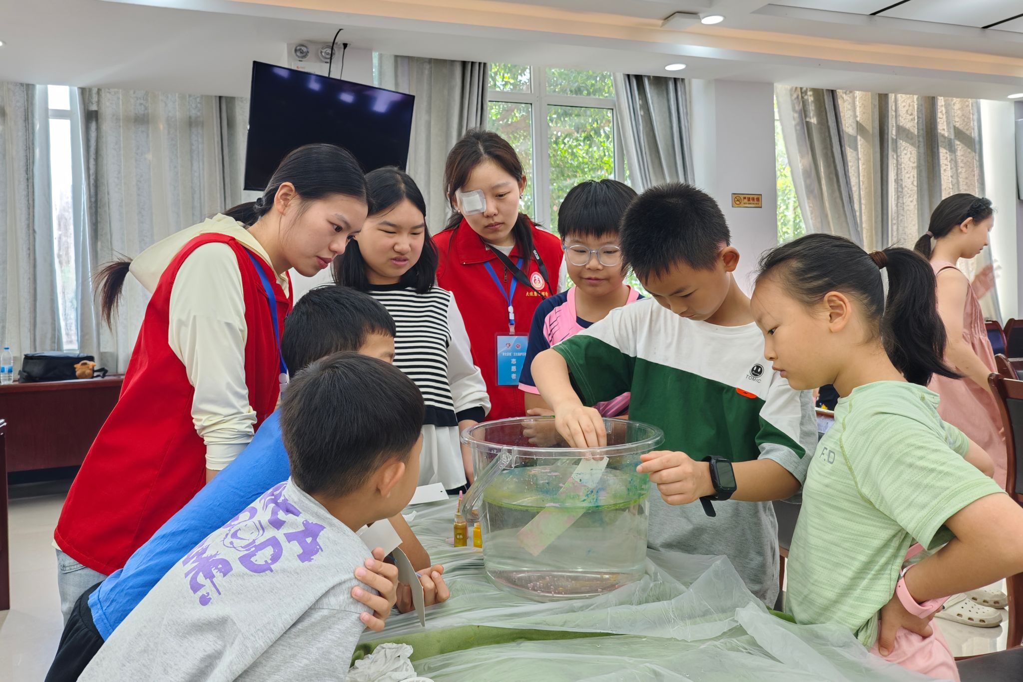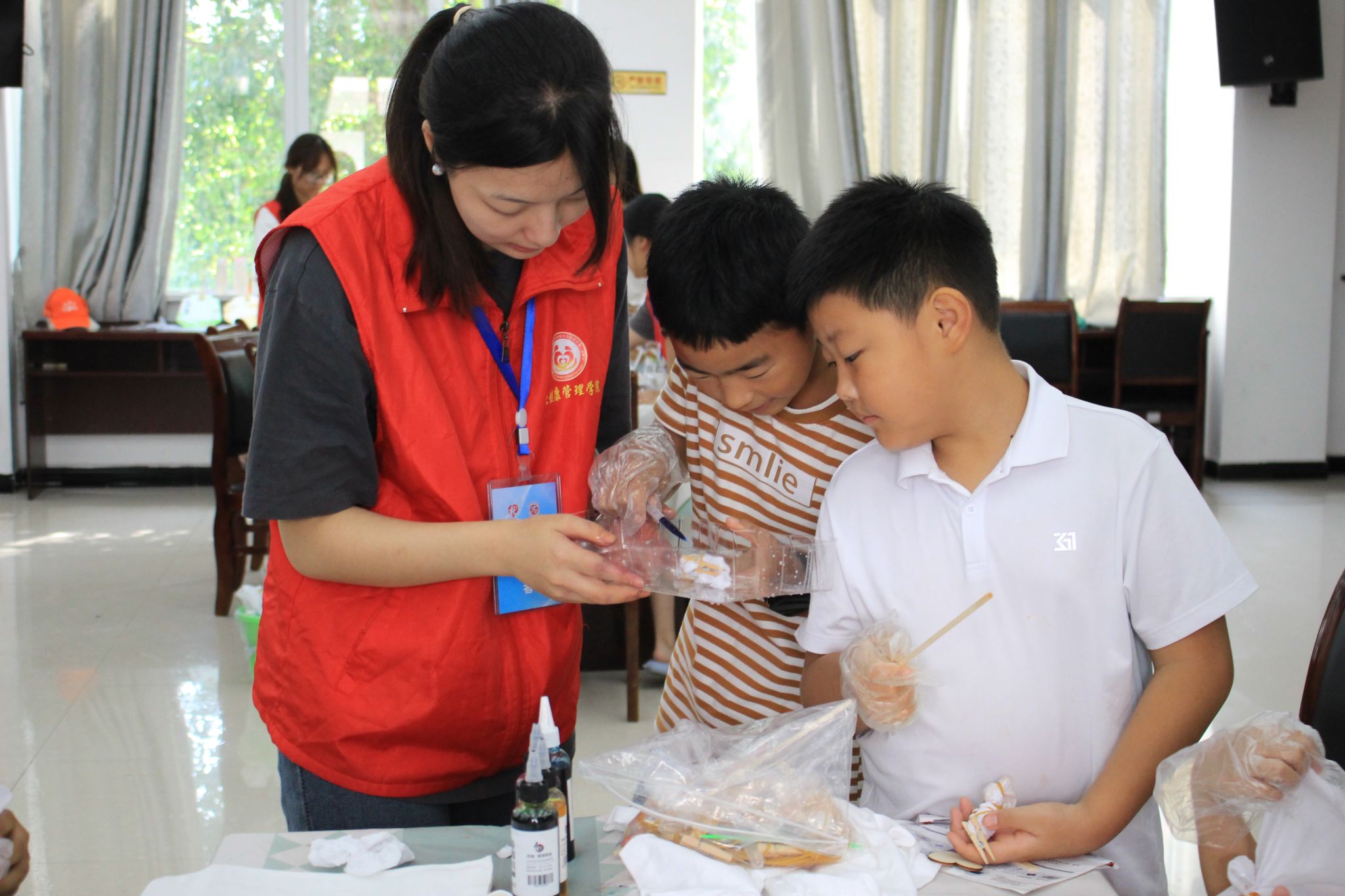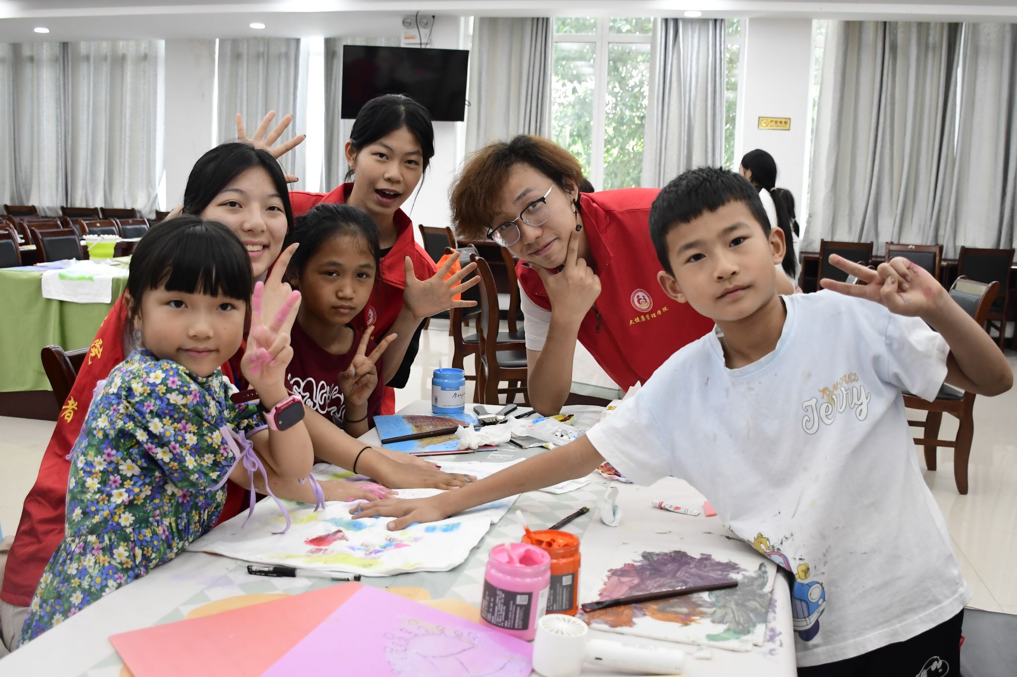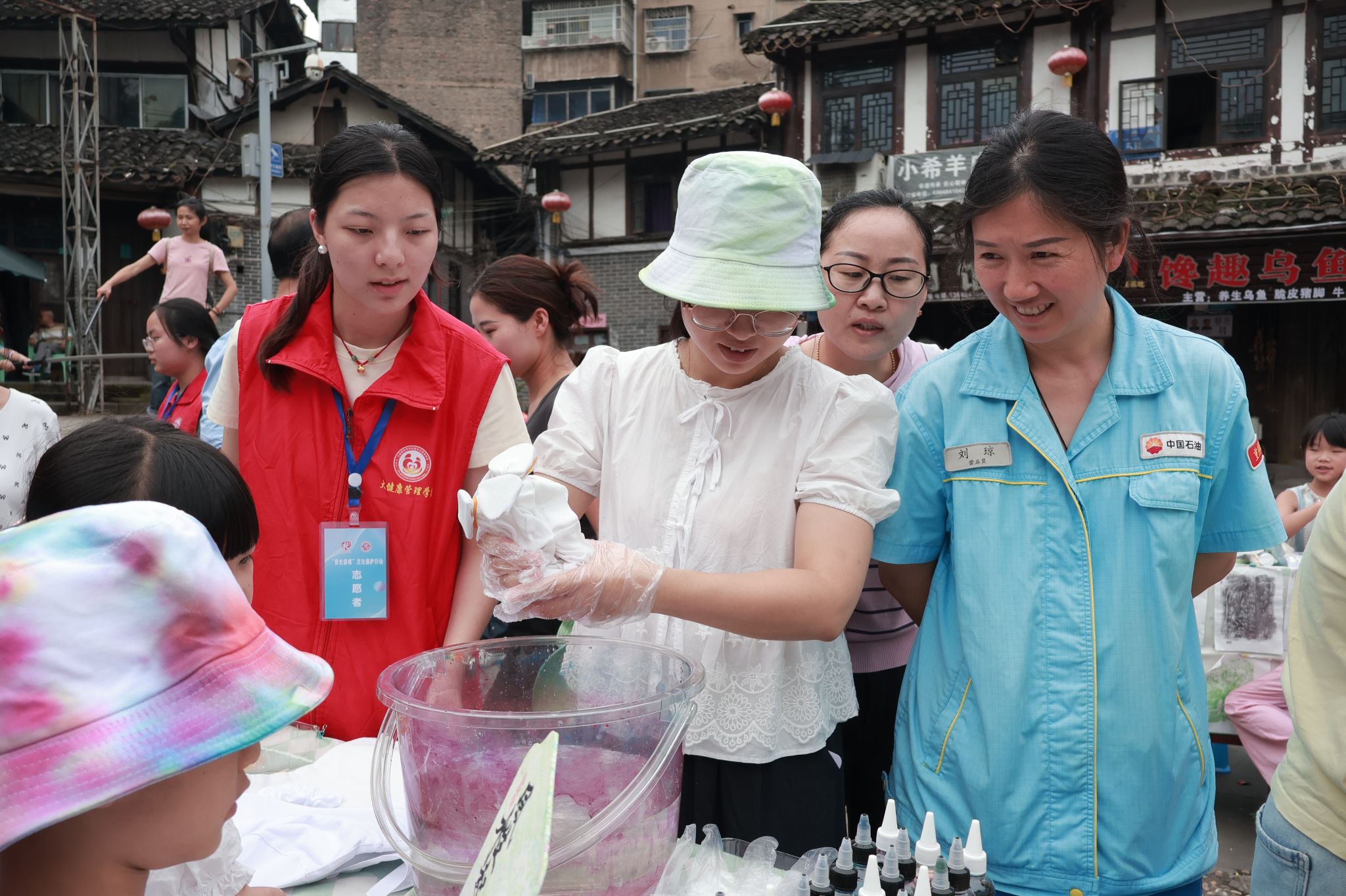 扎染课上,孩子们在志愿者指导下动手操作。“先用线绳把白布扎紧,然后放进染料里,解开后就能看到自己设计的图案了。”孩子们看着亲手完成的色彩斑斓的扎染作品,脸上充满兴奋。一位参与的孩子说:“没想到白布能变出这么好看的花纹!”