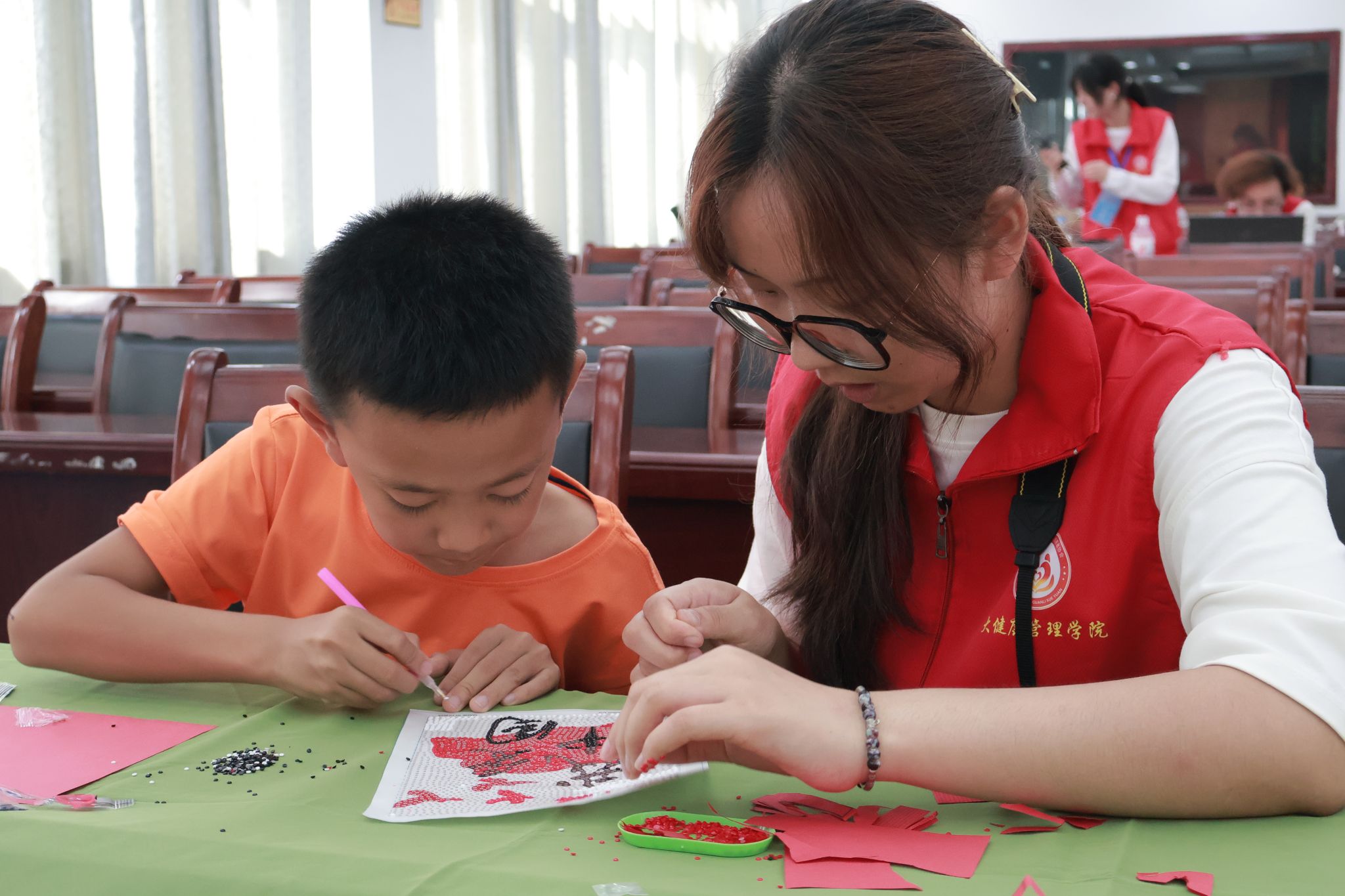 新颖的钻石画课程同样受欢迎。孩子们在预先绘制好图案的画板上,仔细粘贴彩色小颗粒。经过耐心拼接,普通画板逐渐焕发光彩。“要选对颜色,贴整齐,”一位小创作者认真地分享心得。这些课程让孩子们近距离接触了扎染、漆扇、版画等非遗技艺,在动手实践中提升审美与创造力,实现了“非遗”与“美育”的完美跨界融合。