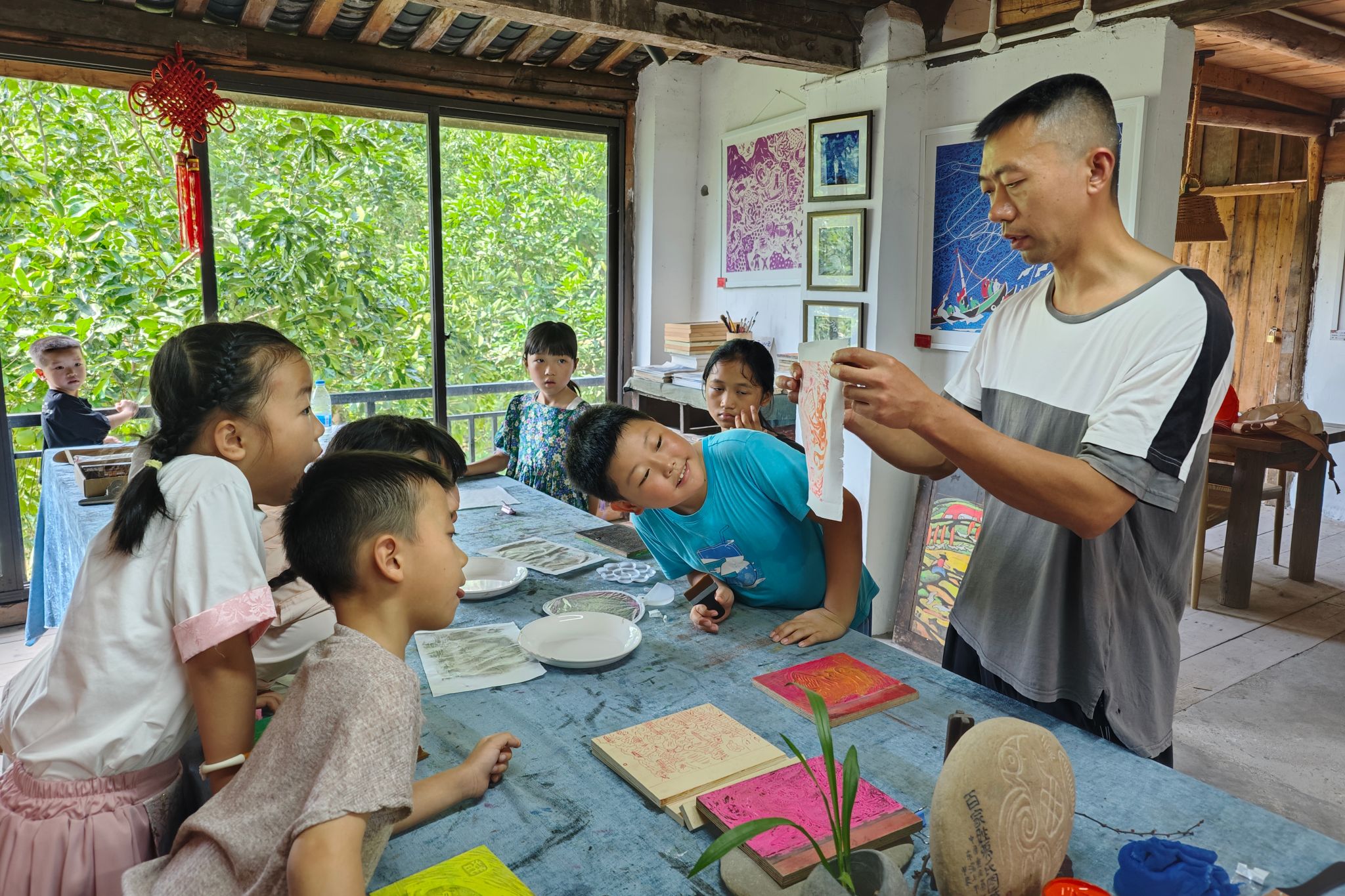 在版画制作课中,孩子们参观了当地非遗版画传承人的工坊并体验了基础制作。回到课堂,他们利用吹塑纸进行创作,孩子们从构思生活场景到完成拓印,体会着创作的乐趣。一位女孩拿着自己的版画作品说:“我画的是我家门口的石板路。”