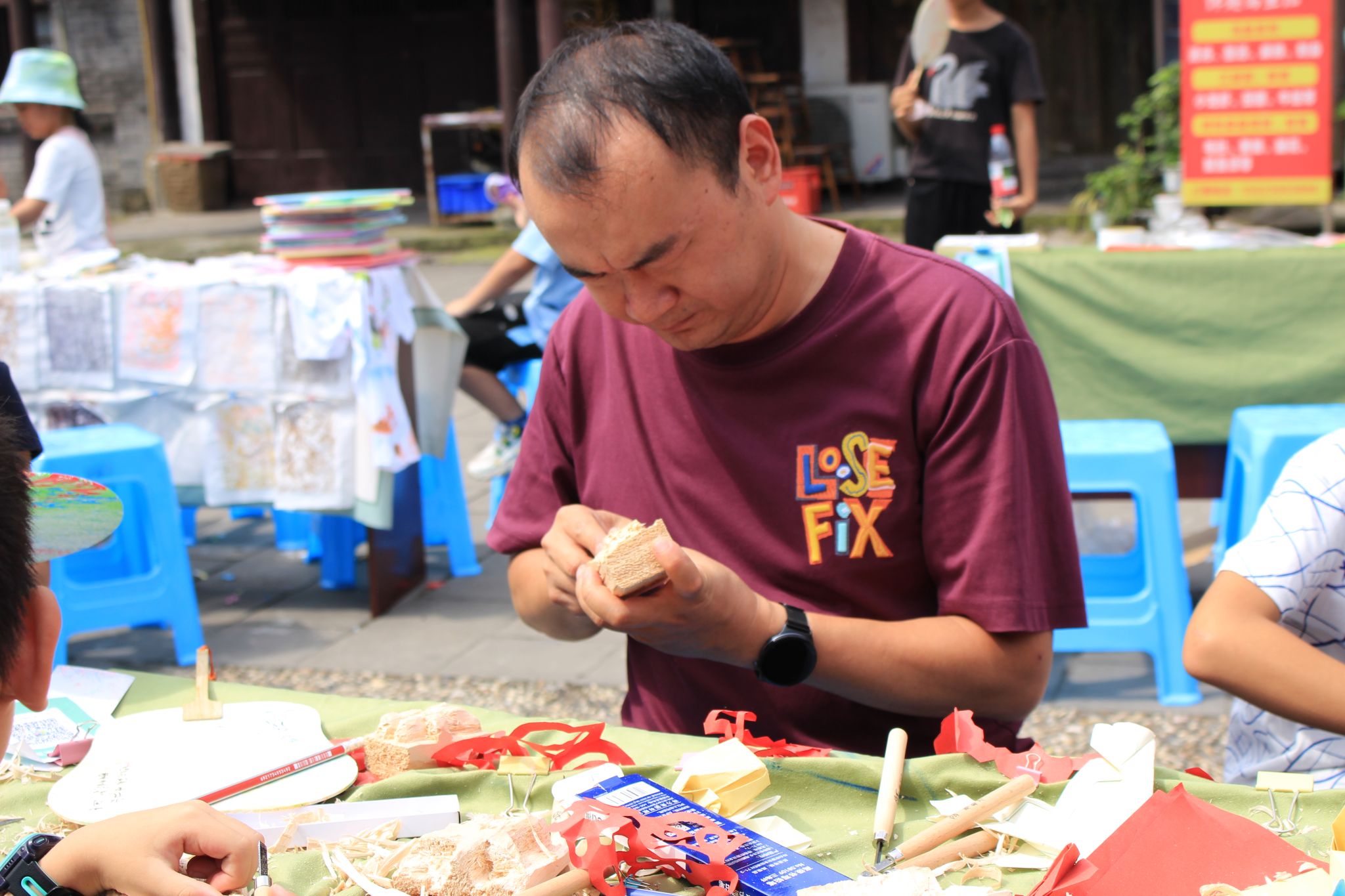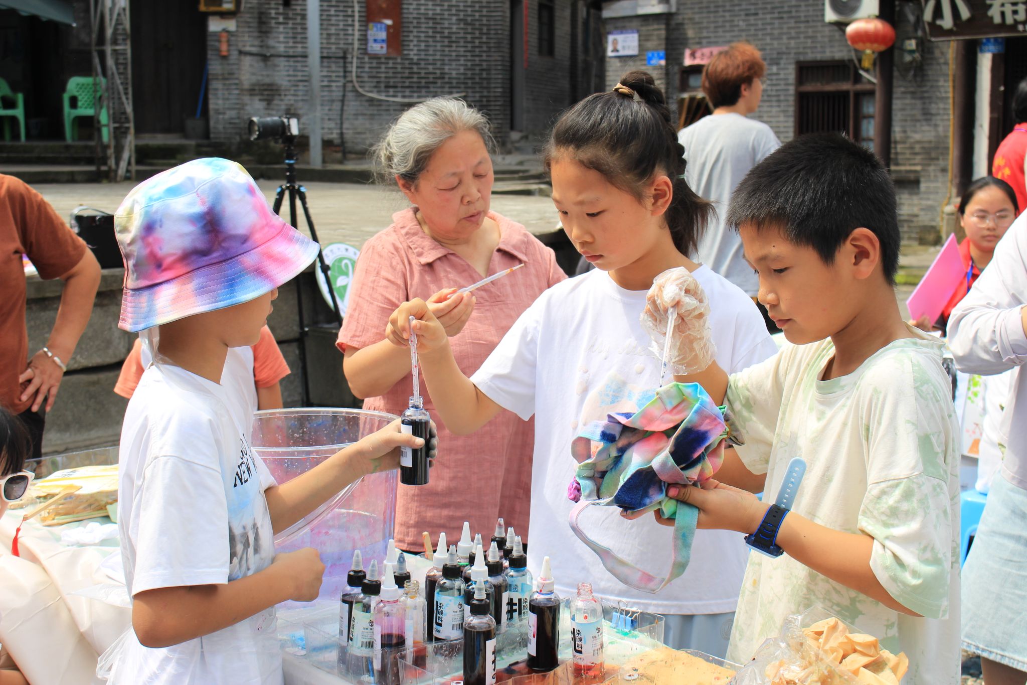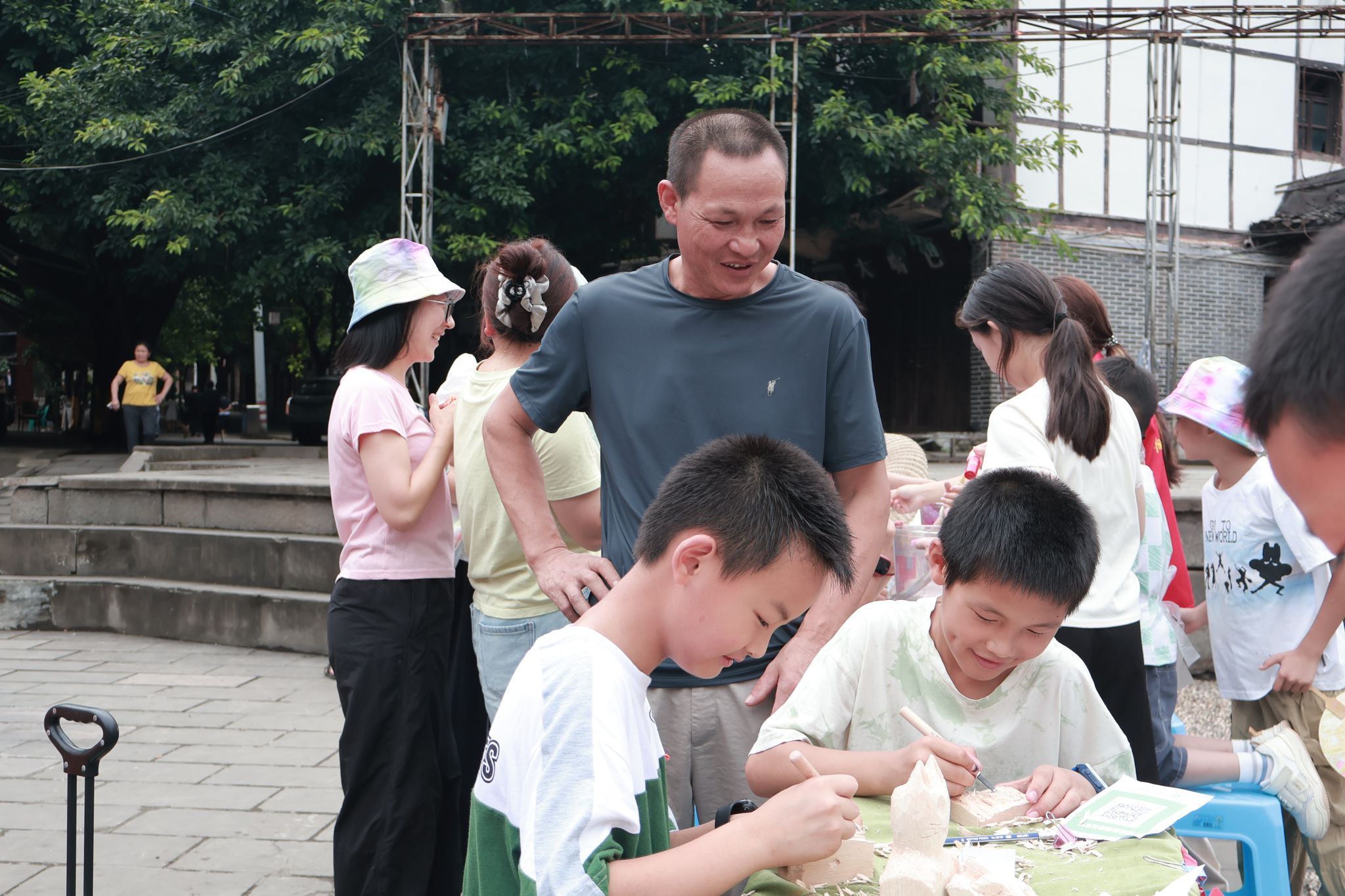 “大家看,这块靛蓝扎染的花纹,就像我们东溪清晨河面上的雾气!”在扎染漆扇体验区,孩子们指着自己参与制作的作品,像模像样地向围观的叔叔阿姨讲解着扎染的奥秘。这不是个例。活动现场,经过前四天扎染、木雕、剪纸、版画等非遗技艺的系统学习与实践,孩子们早已褪去最初的生涩,穿梭于各个体验区,用稚嫩却清晰的童声,向络绎不绝的市民游客介绍东溪古镇的非遗故事和手中技艺的精妙。从染料的选择到图案的寓意,从刻刀的握法到拓印的力道,孩子们讲解得头头是道,眼神里闪烁着自信与热爱的光芒。童言童语中流淌的,是对家乡文化最真挚的理解与自豪。