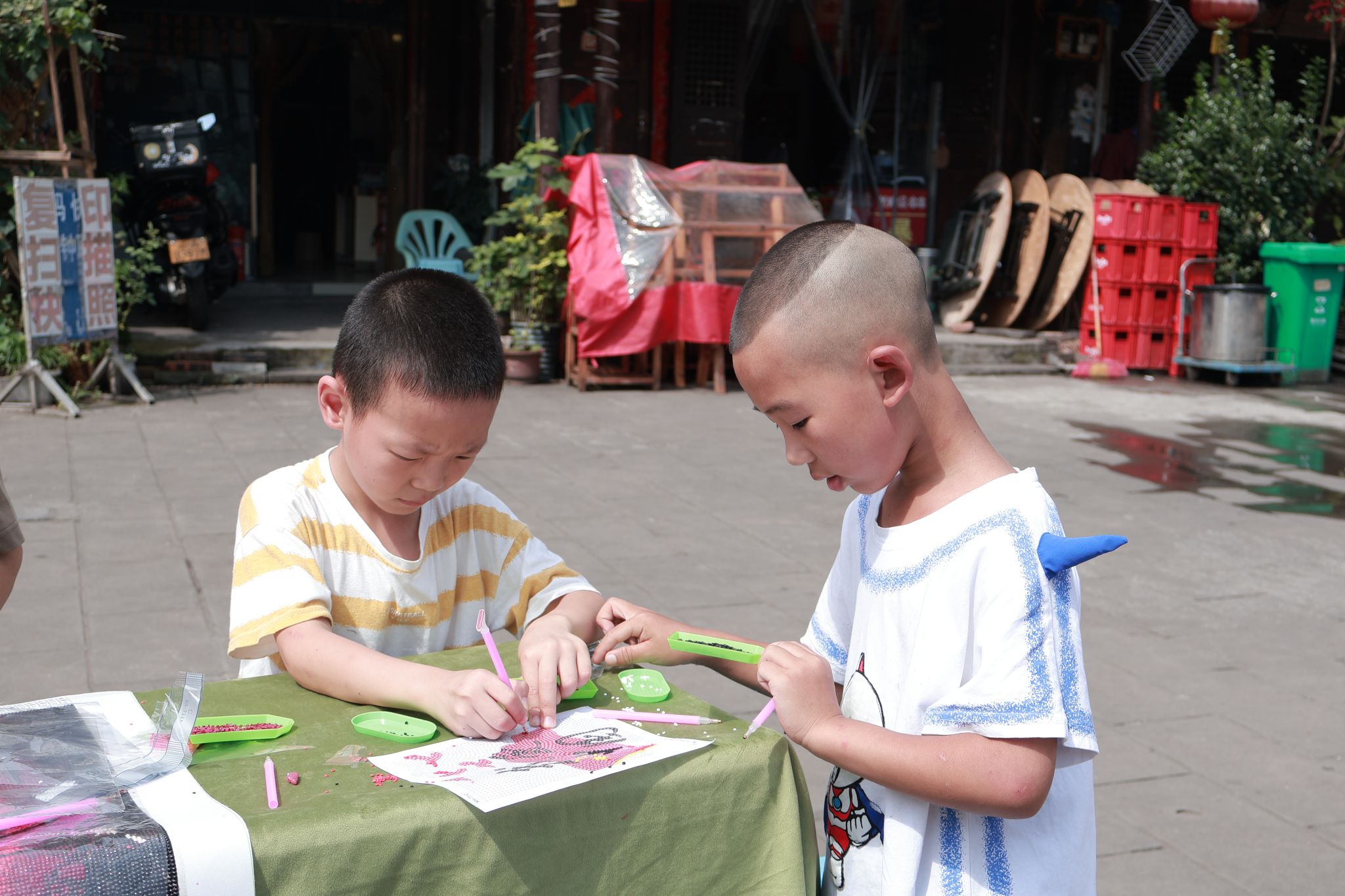 孩子们不仅是讲解者,更是实践的“小老师”。在木雕剪纸区,孩子们一边演示如何用刻刀勾勒古镇老桥的轮廓,一边轻声指导一位叔叔:“手腕要稳,慢慢来,这里刻深一点花纹才清晰。”钻石画体验台前,几个孩子耐心地教小朋友如何用闪亮的小钻拼贴出古镇的风貌;版画区里,“小师傅”们则手把手带领大家感受拓印的乐趣。