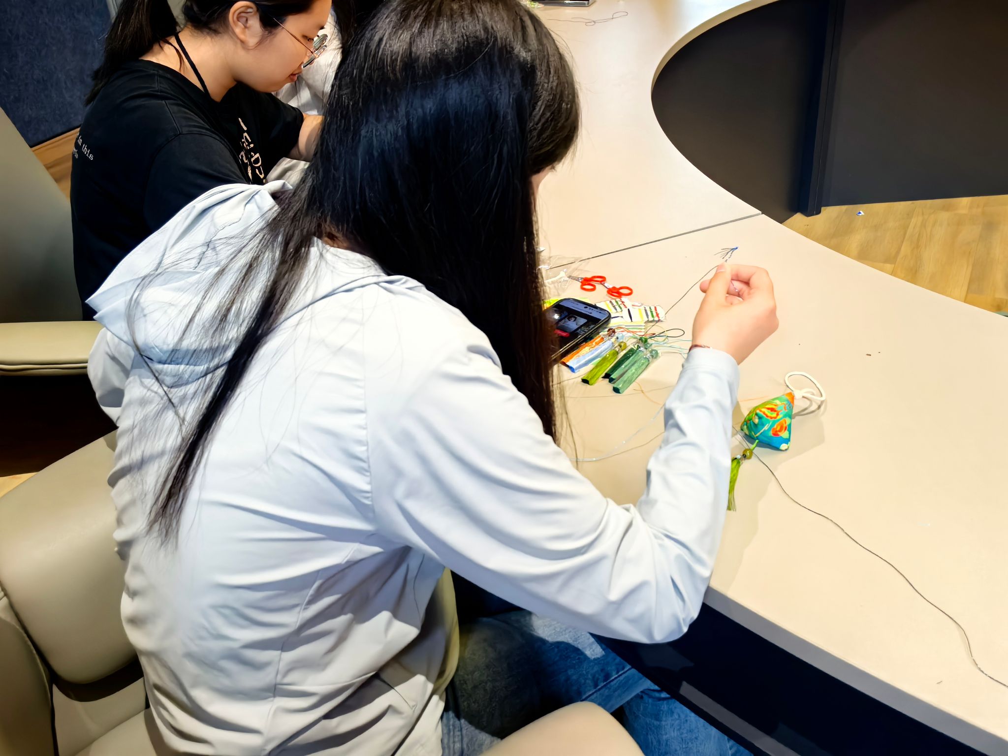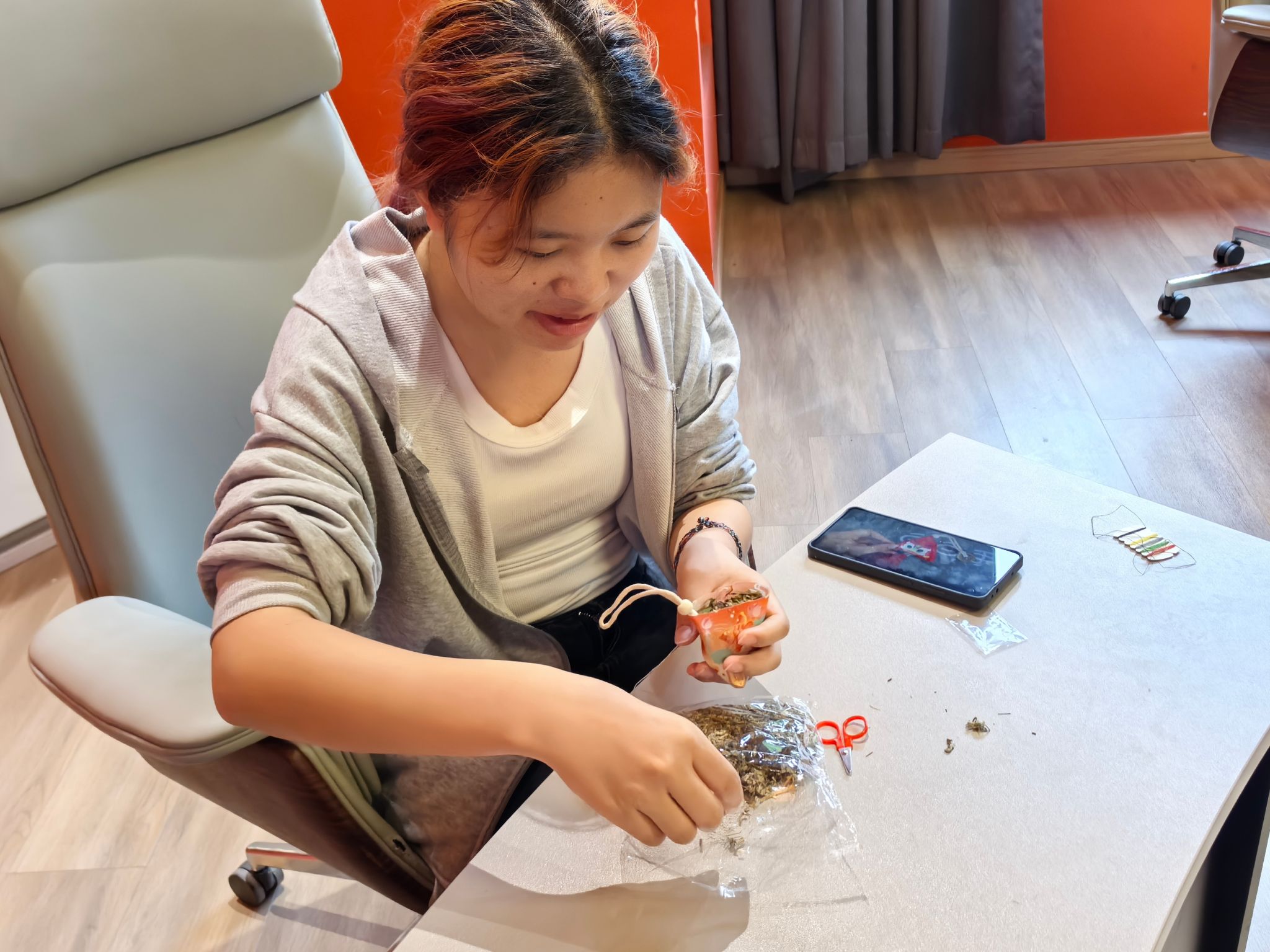 手工制作环节,现场分为“五彩绳编织区”与“艾草香囊制作区”,让传统文化以可触可感的方式融入校园生活。参与者们根据兴趣自主选择体验项目。象征五行相生相克的五彩绳;避邪禳毒的艾草香囊。这些手工制品不仅是学生创造力的体现,更成为传统文化“活起来”的生动注脚——当年轻人用现代设计语言重新诠释传统工艺,千年民俗便在经纬交织与针脚起落中完成了与时代的对话。