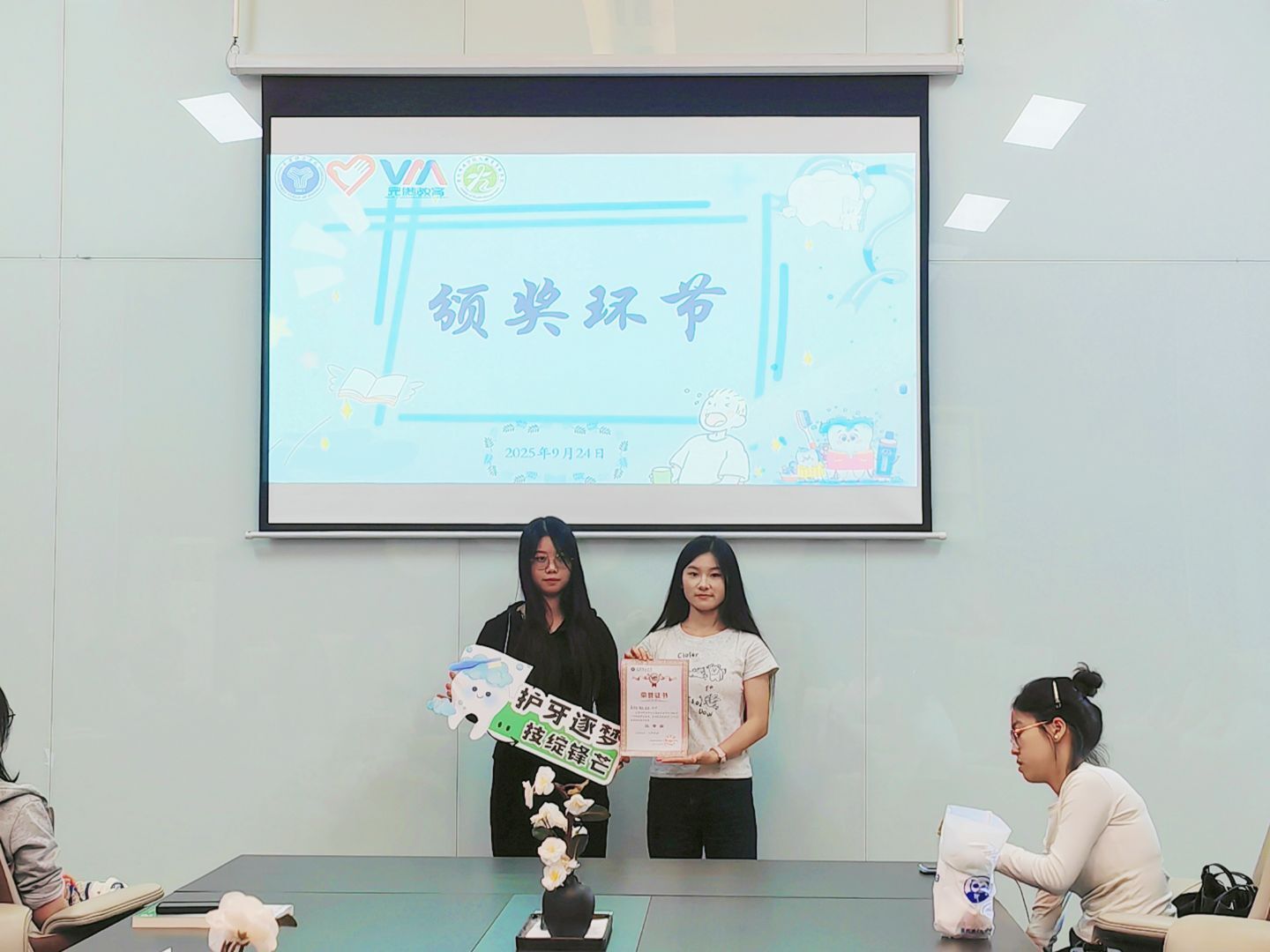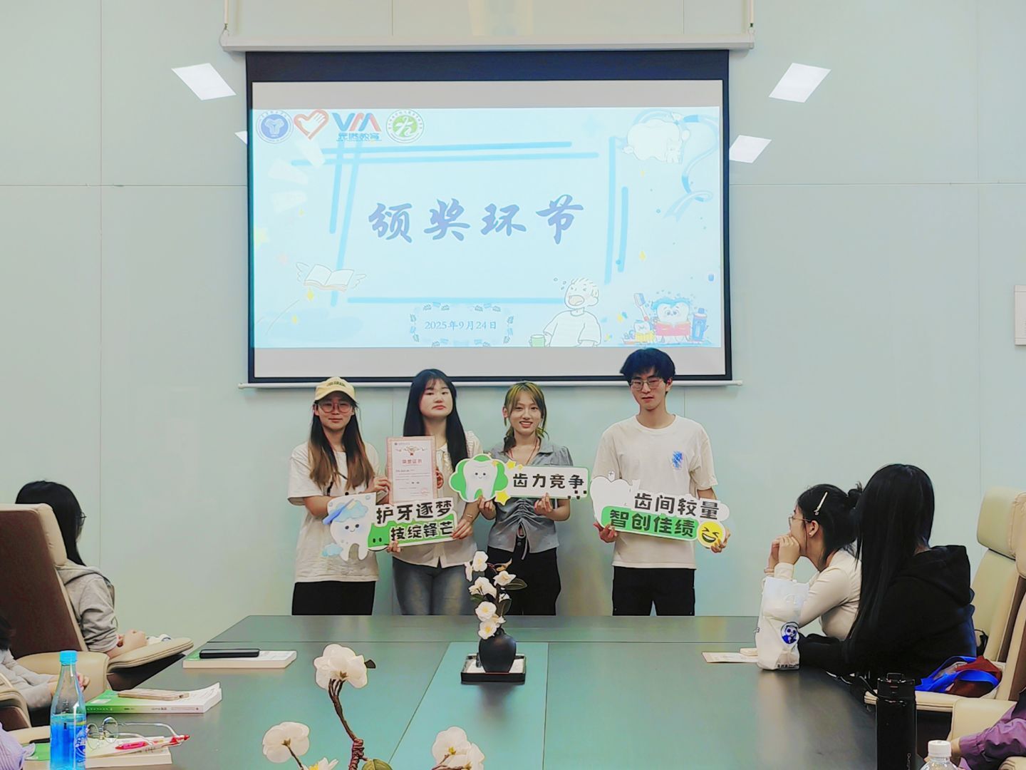 获奖学生代表上台分享了创意策划的灵感来源与设计理念,并表达了自己对口腔健康宣传工作的热情与责任。活动最后,全体参与师生合影留念,共同记录这一富有意义的时刻。