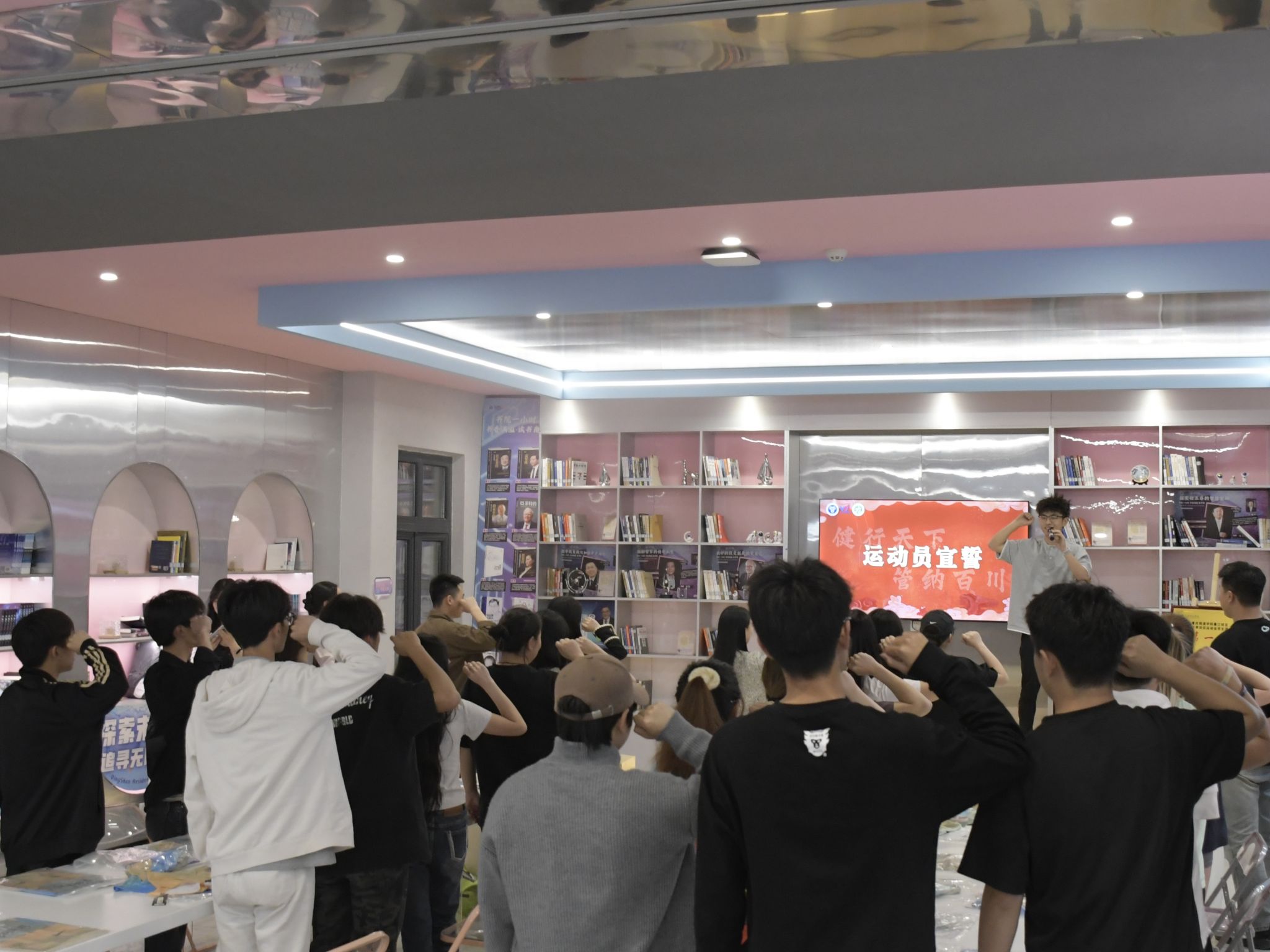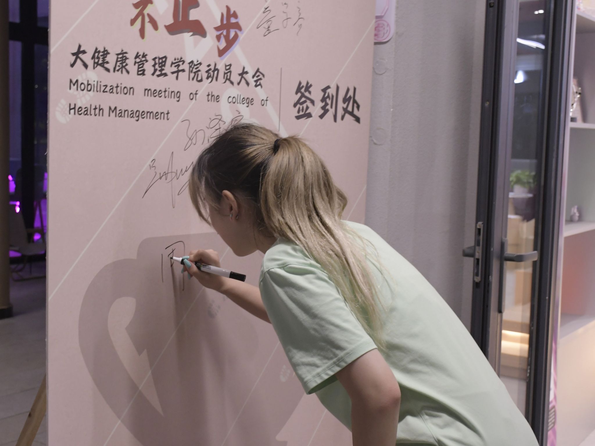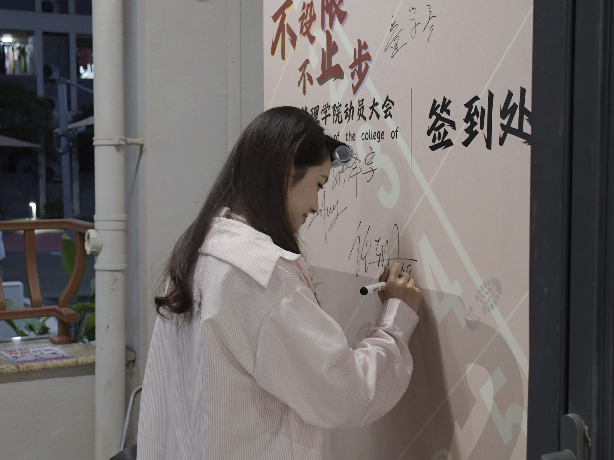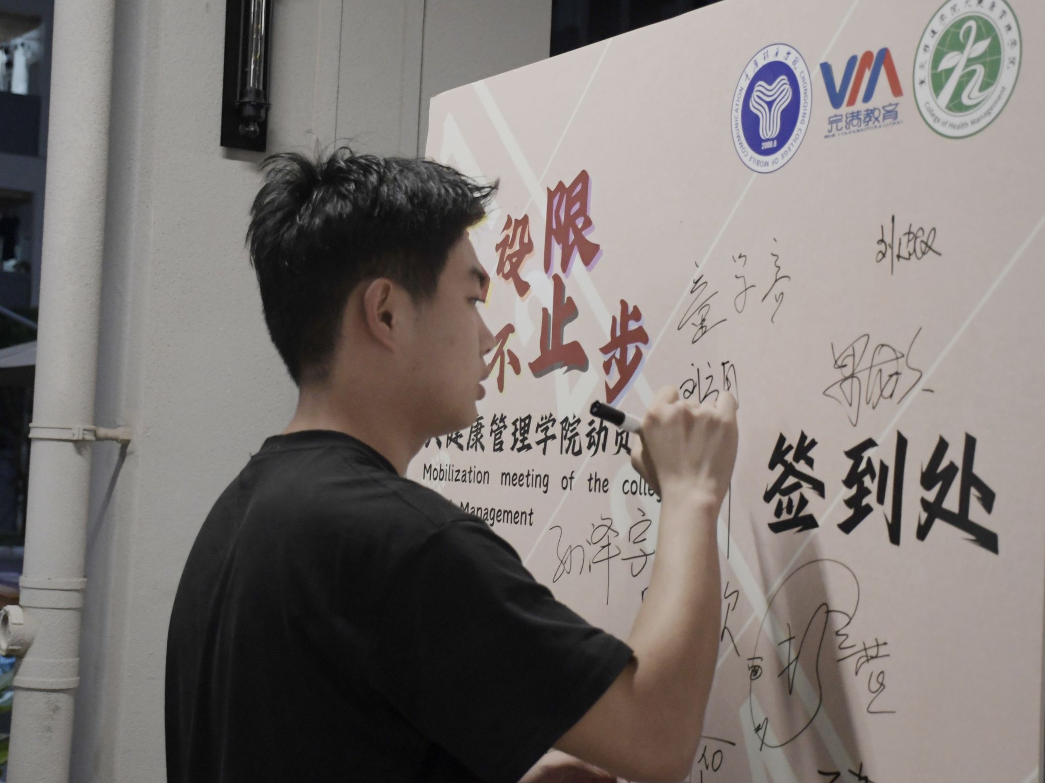 在动员大会的热烈氛围中,运动员们纷纷走向特设的签到墙,他们满怀激情地拿起笔,在照片墙上郑重地签下了自己的名字。每一个签名都承载着他们对即将到来的春季运动会的坚定决心和无限期待,仿佛是在向全院师生宣告:他们已经准备好,将以最饱满的热情、最昂扬的斗志,投入到这场体育盛宴中,为学院争光添彩,共同铸就辉煌的篇章。