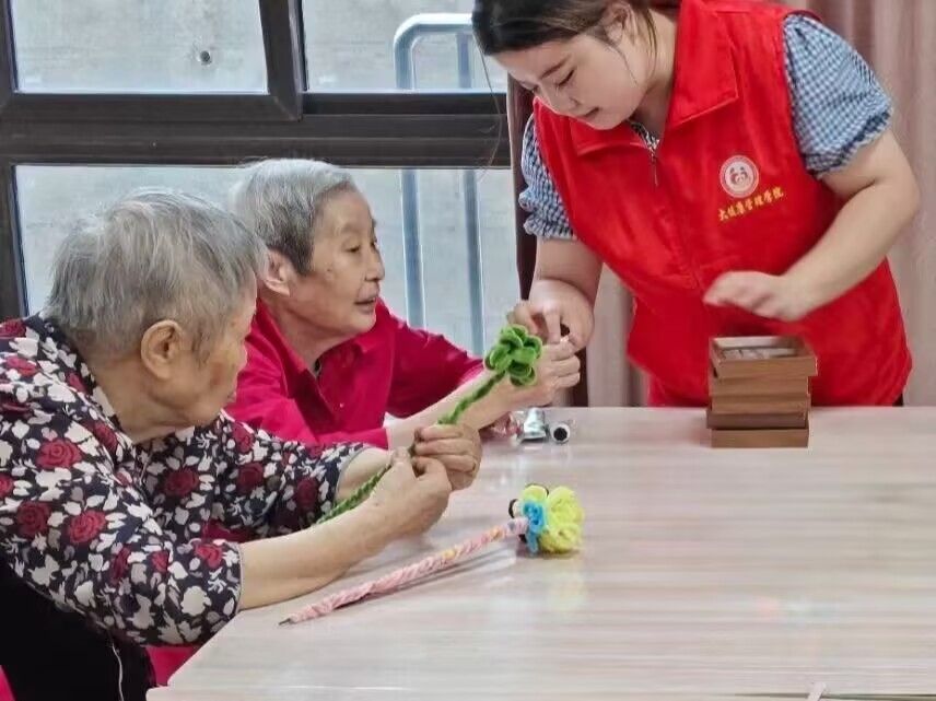 活动伊始,志愿者们贴心询问老人身体状况,陪他们聊天,拉近彼此距离。随后,大家共同制作扭扭棒作品,不仅锻炼了老人的手部灵活度,也促进了其手眼协调的能力。