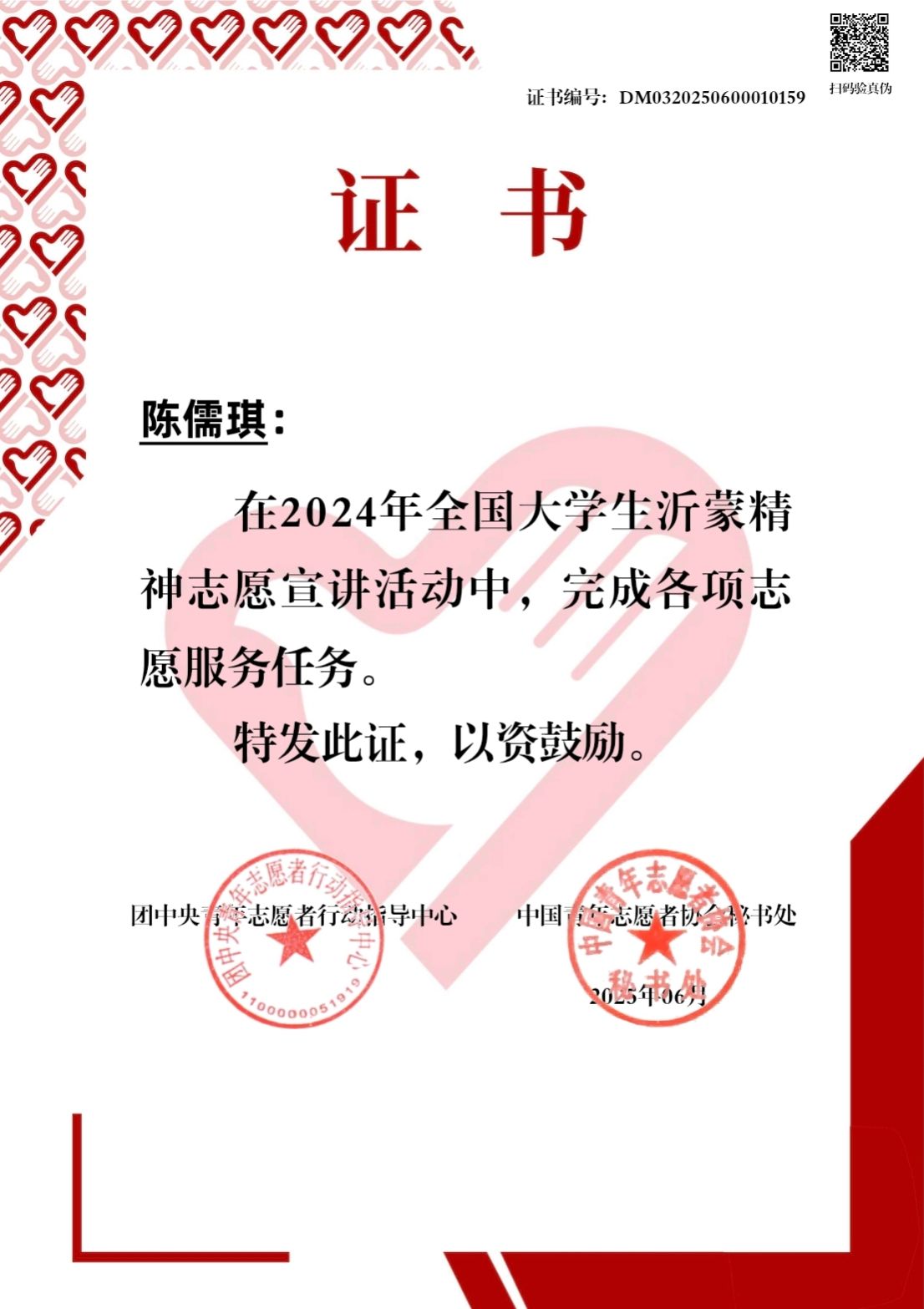 大学期间,陈儒琪被评为“百名优秀志愿者”“青年志愿者先进个人”,从一名普通干事成长为活动组织者,策划了旧物回收、爱心义卖、社区陪伴等一系列活动。看着一件件物资被送往需要的人手中,陈儒琪更加明白了她坚持志愿的意义。在志愿服务的路上,她从校内的一次次小活动,慢慢走向校外从老瀛山越野赛到国际标准舞巡回赛,从赛后拉伸到现场协调,她走的每一步,每一个脚印都是她志愿之路的证明。