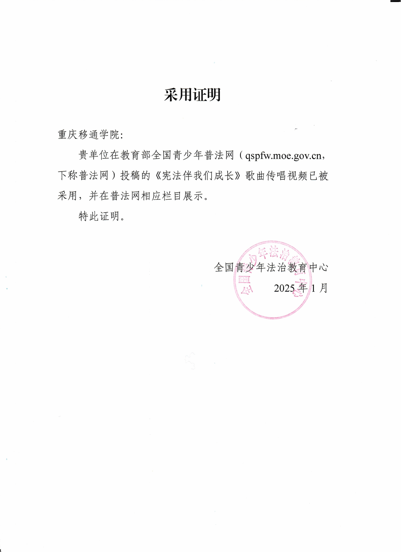 2024年10月的一次任务,让他的镜头真正刻上了“使命”的烙印。国庆假期尾声,他接到紧急任务——五天内完成《宪法伴我们成长》主题MV的拍摄与制作。“从脚本到拍摄都是从零开始,那几天团队几乎要住在办公室了。”他回忆道。为呈现宪法的庄严感,他带领部长通宵打磨分镜;为呈现宪法的庄严感,他反复调整镜头角度......最终,这支MV从数百件普法作品中脱颖而出,成为重庆移通学院双校区唯一入选教育部全国青少年普法网轮播的精品。“能用镜头传递宪法的力量,是责任,也是荣幸。”他说。