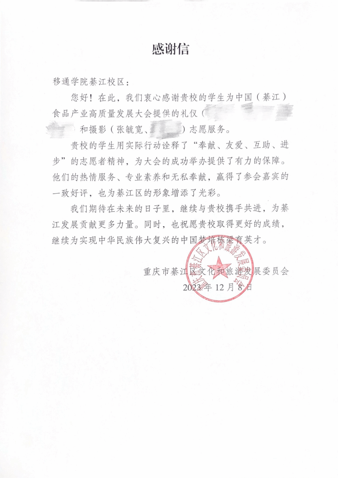 2023年12月,张毓宽迎来了大学生涯的重要转折点。綦江区文旅委委托学校拍摄重要活动素材,他和另一位部长被指导老师选中,以媒体记者身份全程参与首届綦江(中国)食品产业高质量发展大会的拍摄工作。活动结束后,团队收到了来自重庆市綦江区文化和旅游发展委员会的感谢信。