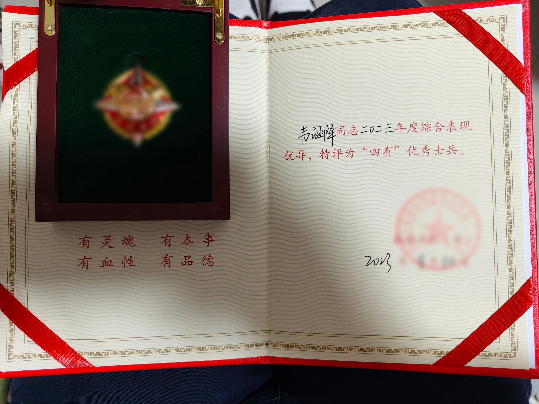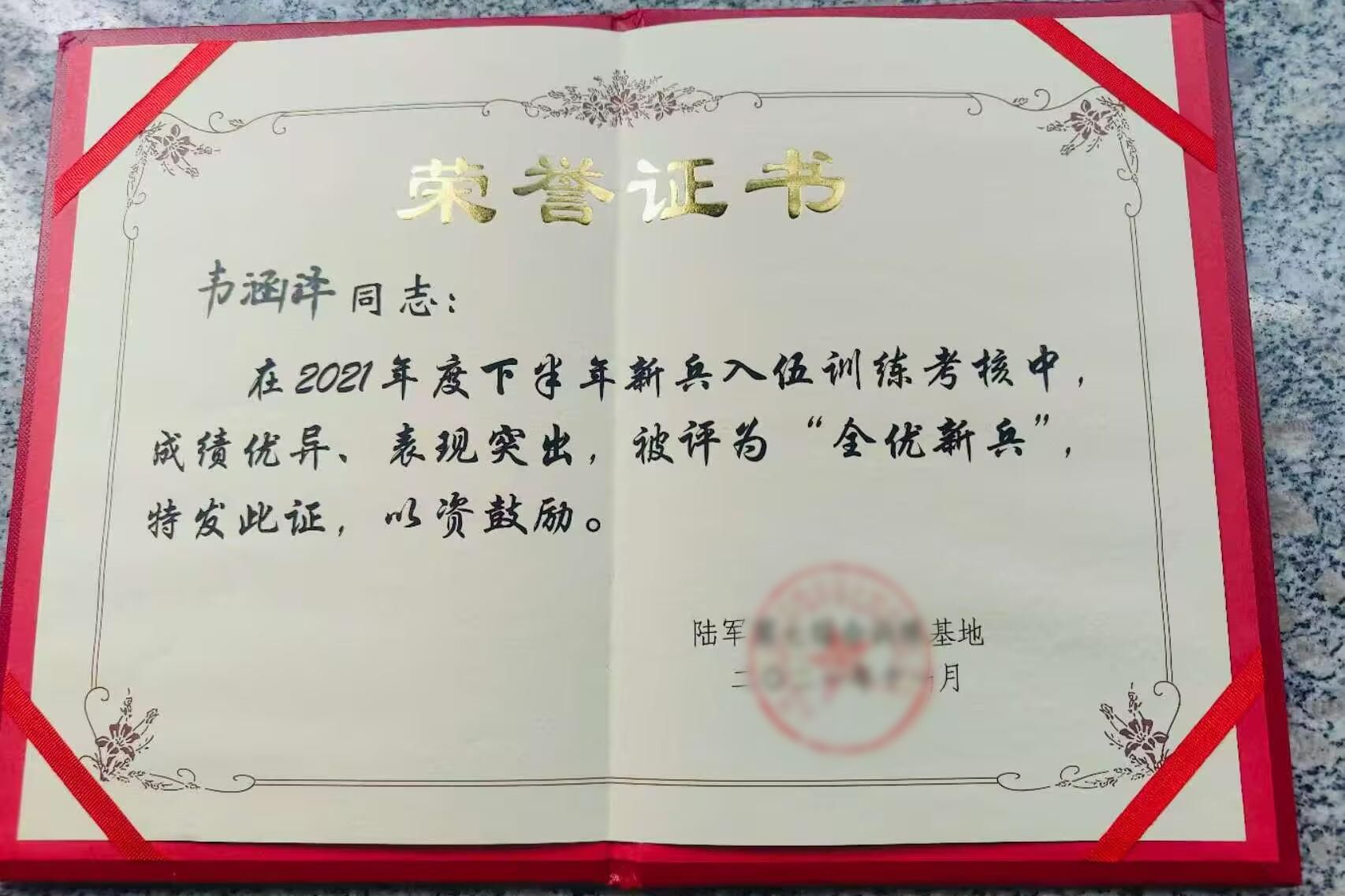 然而,艰苦的环境并未击退他,反而激发了他的斗志。在结业考核中,他凭借出色的表现,取得了令人瞩目的成绩:95式步枪射击第二名、3公里跑用时11分30秒、战术匍匐比标准快9秒。集训营颁发的“全优新兵”证书,便是对他这段艰苦训练时光的最佳褒奖。