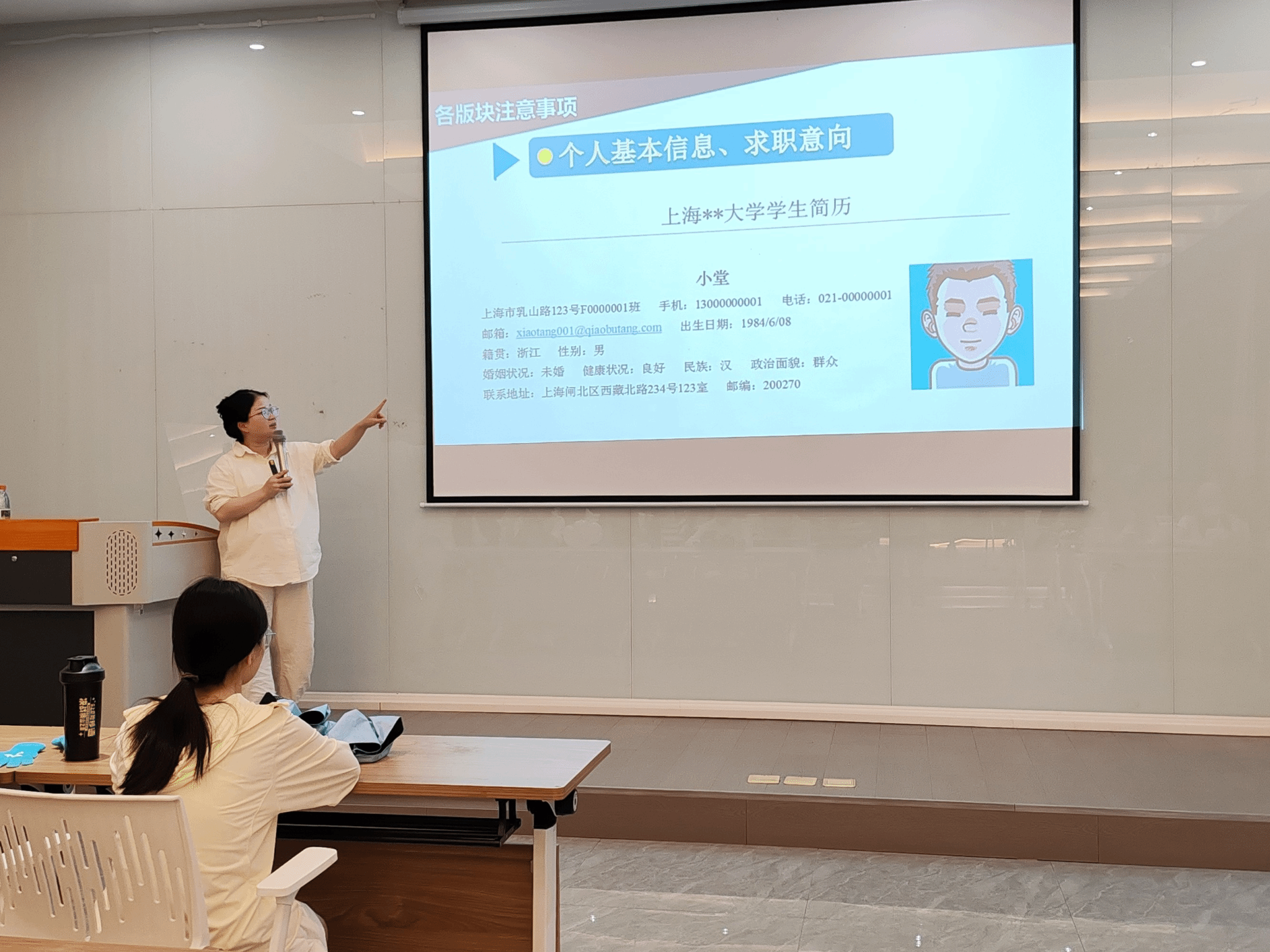 简历是求职的“敲门砖”,如何让它在海量竞争中脱颖而出?阙小梅老师以“简历制作”为主题,为学员带来一场干货满满的实操课。阙老师通过对比优秀与不合格简历案例,逐条拆解了“STAR法则”(情境-任务-行动-结果)的应用技巧,并现场指导学员优化个人简历。针对跨专业求职者,她特别强调“技能迁移”和“成果数据化”的重要性。课程尾声,学员们通过“简历互评”环节互相学习,阙老师更评选出三份“最佳简历”进行展示。直击简历撰写痛点,帮助学员掌握简历逻辑与设计技巧。不少同学认识到:原来简历不是经历的堆砌,而是个人价值的精准表达。