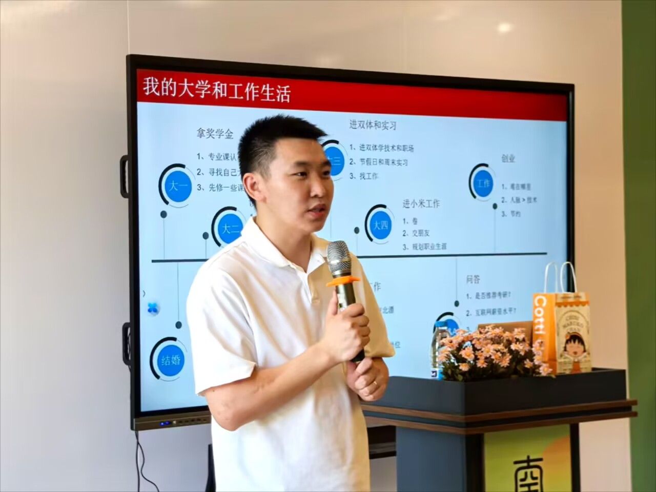 胡权老师从他的大学生活开始讲起,“拿奖学金、当部长、谈恋爱、进双体......”轻松幽默的话语勾勒出在移通多维成长的大学生活图景。从入职滴滴开启职业生涯,到结束北漂返渝发展,再到入职小米后创业的充实经历让同学们感到心潮澎湃。这不仅传递了迎难而上的奋斗精神,更以“躬身入局”的实践理念,激励青年学子夯实专业基础、拓宽认知边界。