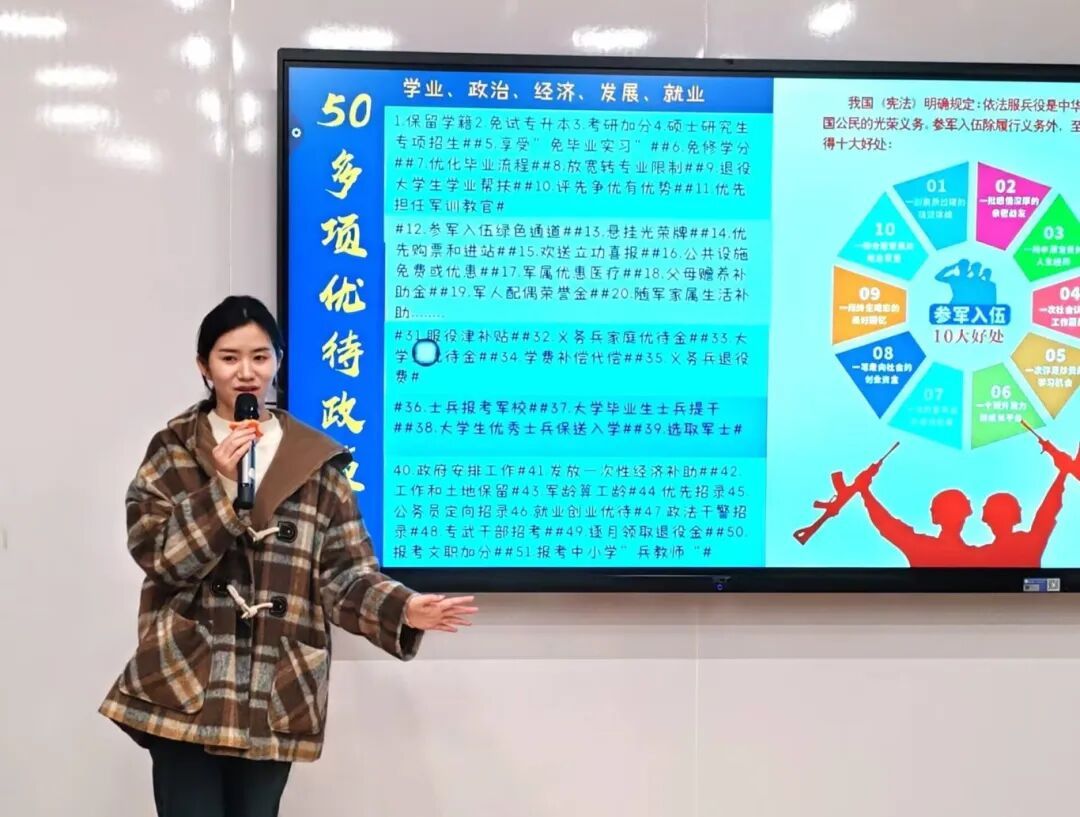 在分享环节结束后,进入了互动交流环节。同学们积极提问,就如何在大学生活中培养自己的坚韧品质、如何选择适合自己的职业方向以及如何将军队的优秀文化融入校园生活等问题向李梦雪老师请教。李梦雪老师耐心倾听,结合自己的亲身经历给出了切实可行的建议。她鼓励同学们要勇于挑战自我,不断积累经验,树立远大的理想,为实现人生价值而努力奋斗。